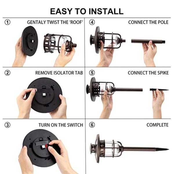 4. 【Easy To Install】Assembles quickly, just remove the tab under the light cap, turn on the switch, pull out the bottom spike from the tube, install it and insert the light into the soft earth. No addition tools or wiring required. Auto-on at dusk and Auto-off at dawn.